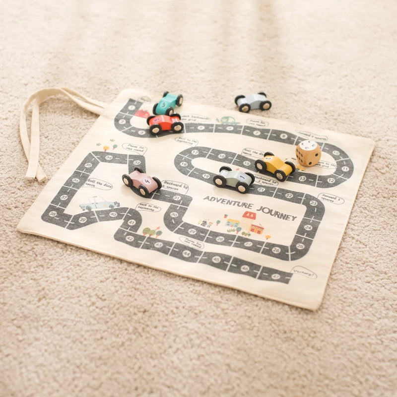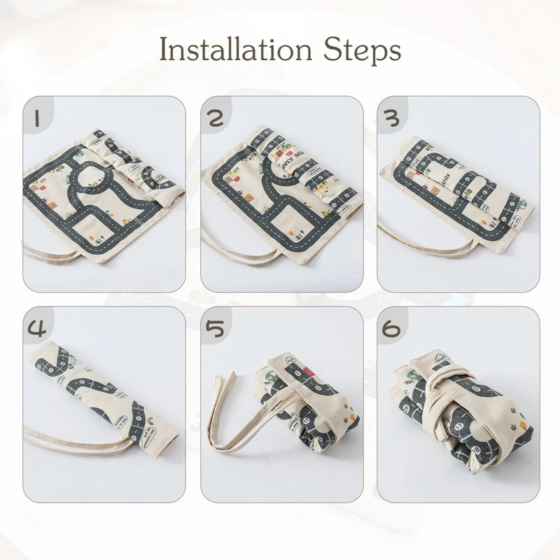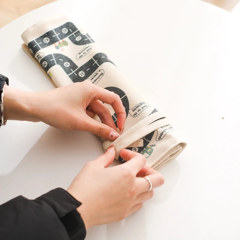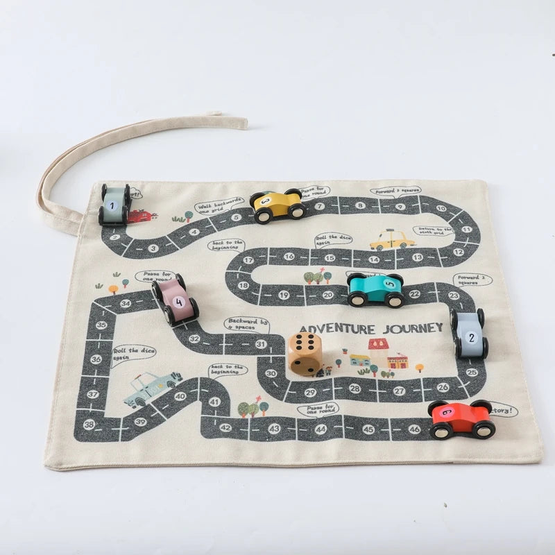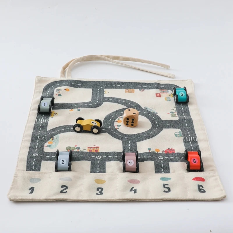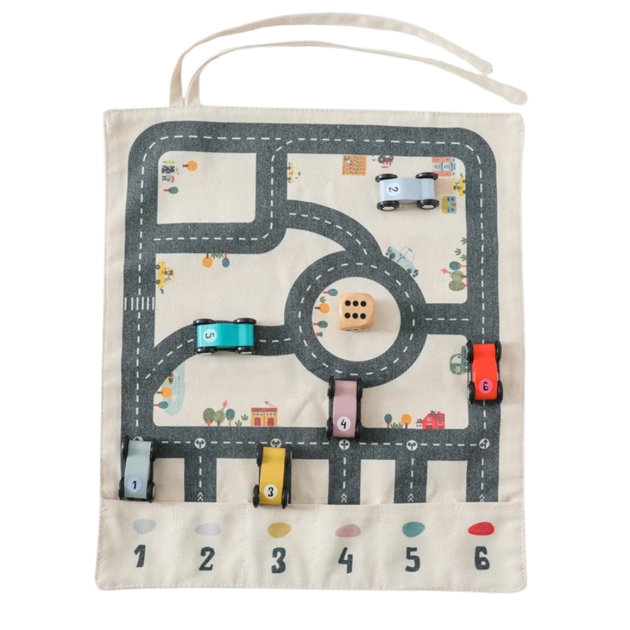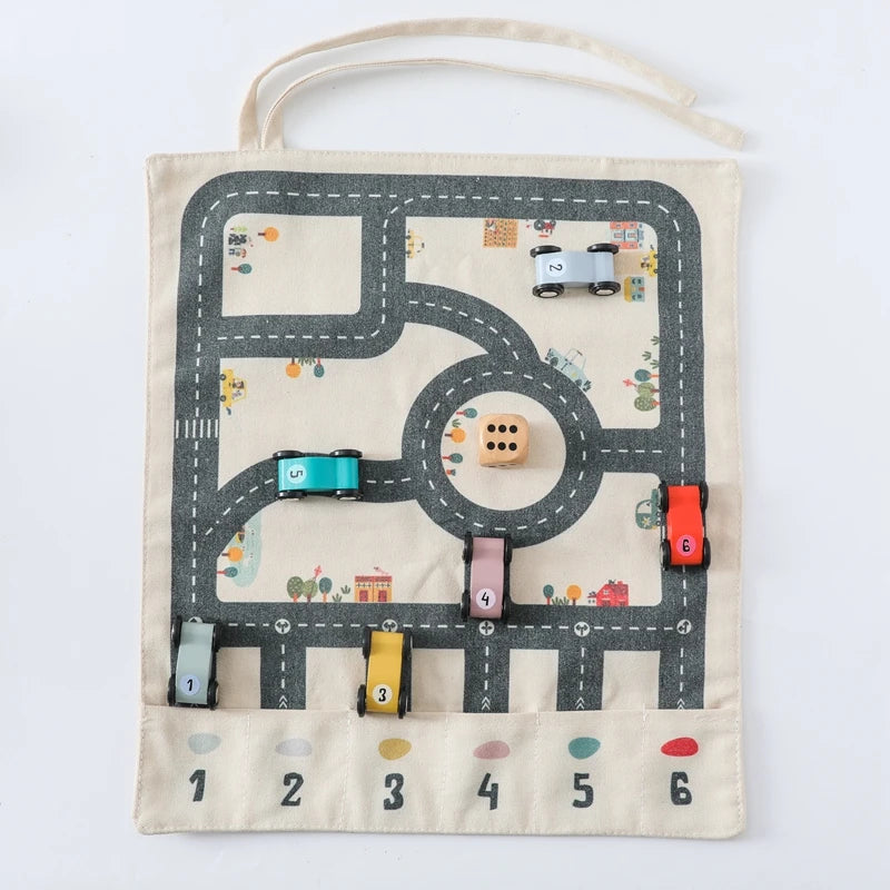 MiniRoute Montessori Kjørematte i Lerret med Læring og Lek i Fokus forener kreativ lek med pedagogisk utvikling. Denne interaktive kjørebanematten i mykt lerret gir barnet ditt en morsom og lærerik opplevelse med trafikkforståelse, bilkjøring og fantasilek – perfekt for lekne stunder alene eller sammen med deg.